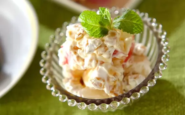 出典:E・レシピティラミスでおなじみのマスカルポーネチーズは、じつはさまざまなデザートに使用できます。こちらのレシピはリンゴ、クルミ、マスカルポーネチーズを混ぜ合わせ、器に盛ります。仕上げにお好みの量のメープルシロップをかけ、ミントの葉を飾れば完成。