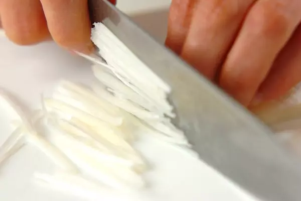 ・白ネギは長さ4~5cmに切り、縦に切り込みを入れて1枚に開き、縦細切りにする。