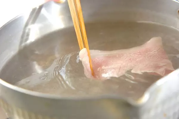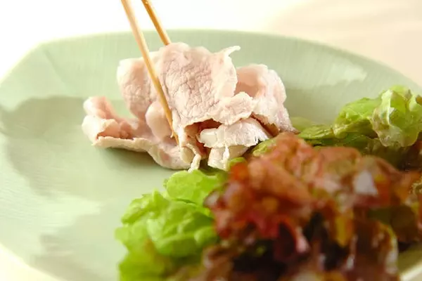1、鍋に湯を沸かし、煮たったら火を止めて酒を加え、豚肉を1枚ずつ菜ばしではさんで泳がすようにゆで、色が変わったらザルに上げ、水気をきる。