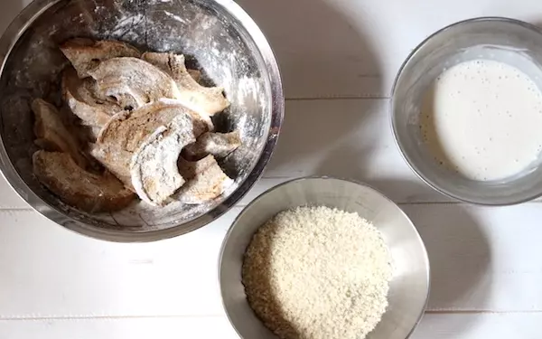 3、ボウルに薄力粉を入れてまぶし、次に薄力粉を同量の水でといたものをまぶし、パン粉をまぶす。