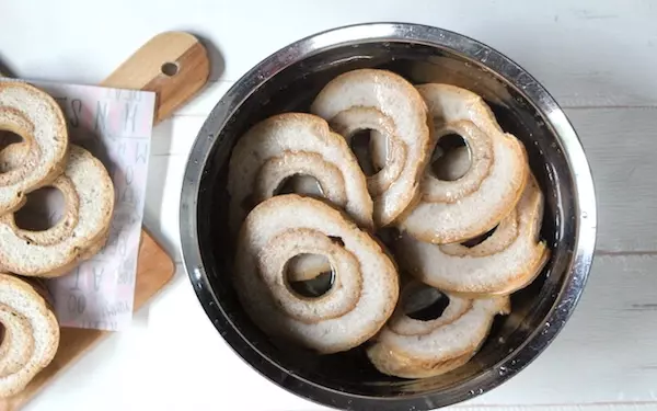 4、フライパンの底から1、2cmのところまで菜種油を入れ、180度に熱して3の両面がきつね色になるまでカラリと揚げる。