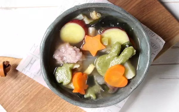 すいとんは水分が多くても少なくても作れますが、今回はお子さんが楽しんですいとんを作れるように、かための生地を作り、型抜きも楽しめるレシピに仕立てました。型がなくても、子どもは台所の芸術家ですから、恐竜やおうちなど、いろいろな形を作ってくれることと思います。すいとんに入れる野菜も型抜きすると、さらに喜んで食べてくれますよ。