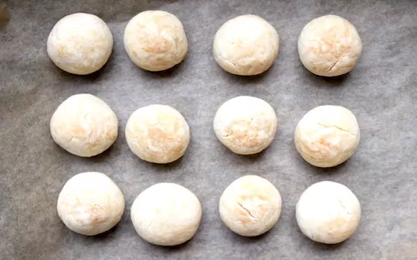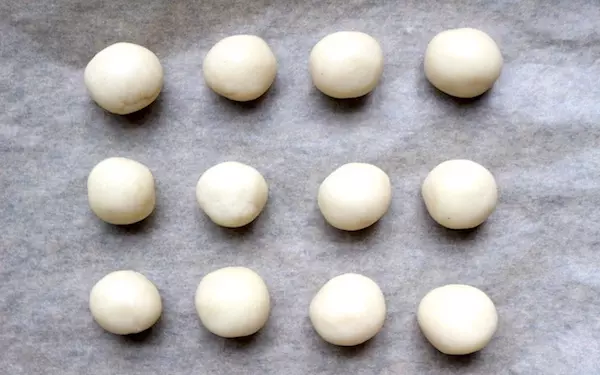 3、1のボウルの真ん中に穴を開けて2を加える。手で混ぜてひとまとめにしたあと、15等分にして丸める。