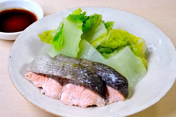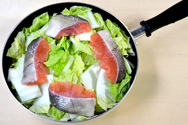 このレシピは、「鶏肉とキャベツのフライパン蒸し」が、もっともシンプルな組み合わせ。野菜とたんぱく質の組み合わせを変えていくと、バリエーションが広がります。下に敷く野菜は、「かさ」のあるキャベツか白菜がいいですよ。上にのせるたんぱく質は、肉なら鶏肉か豚肉、魚なら白菜とキャベツと相性のいいサケがよいでしょう。