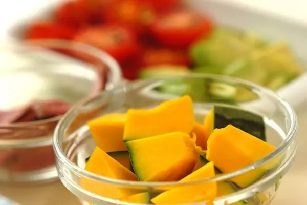 ・カボチャは食べやすい大きさに切り、水でぬらして電子レンジで2分加熱する。竹串でスッとささるまで柔らかくなったら取り出す。アボカドは種を取り除いて皮をむき、食べやすい大きさに切る。プチトマトはヘタを取り除き横半分に切る。