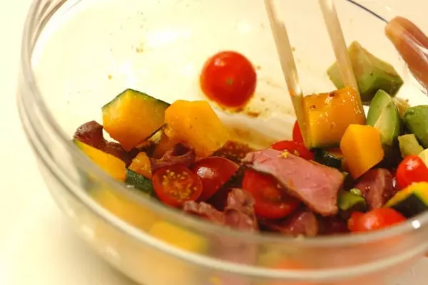 1、<特製ソース>の入ったボウルに、ローストビーフ、カボチャ、アボカド、プチトマト、塩を入れて混ぜ合わせる。
