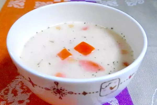 お湯を注ぐ「乾燥ポタージュ」に角切りにしたにんじんをプラス。野菜ごろごろスープに早変わり。
