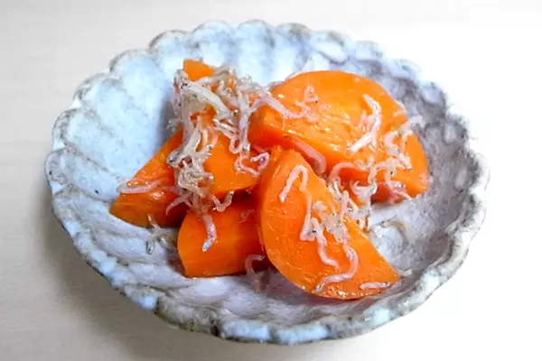 にんじんにオリーブオイルをからめた後、ちりめんじゃこをまぶしつけ、しょうゆをほんのひとたらし。
