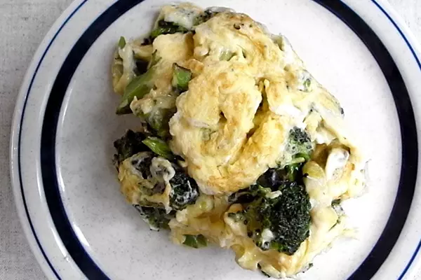 ブロッコリーを細かく刻み、フライパンで塩炒めに。溶き卵にちりめんじゃこを加えて、ブロッコリーと合わせて半熟のうちに皿に盛ります。