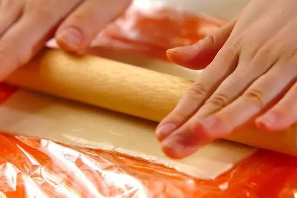 2、冷凍パイシートは使う5分前に室温にもどして、1枚分は半分に切る。ラップにはさんで、ココットより2cmほど大きくのばす。