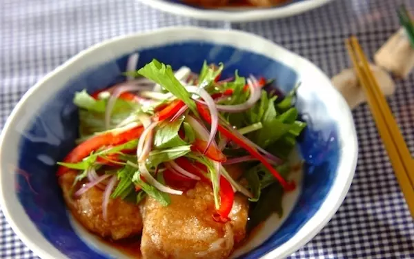 余ったお餅を簡単にアレンジしたいのなら、こちらのレシピがベスト。作り方は、170℃に温めた揚げ油に切り餅を入れ、3分程カリッとするまで揚げます。そして、南蛮酢に揚げたお餅をくぐらせて皿に盛り、水菜、紫玉ネギ、パプリカを盛り合わせ、お好みで南蛮酢をかければ完成です。