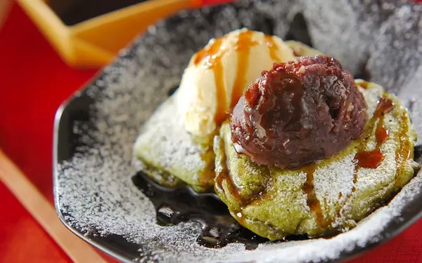 パンケーキのトッピングはお好みで、 黒みつ、 粒あん、バニラアイス、粉糖を飾ってください。お子様向けに、甘さをプラスしたい場合は、バニラアイスと生クリームをダブルでトッピングするのもおすすめ。また黒みつの代わりに、メープルシロップをかけるのもいいでしょう。抹茶の風味がほのかに香る、思わずリピートしたくなる和風スイーツです。