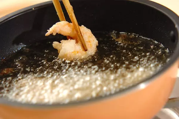 1、170℃に予熱した揚げ油でエビをカリッと揚げ、油をきる。続けて赤パプリカ、ピーマンもサッと揚げて取り出す。