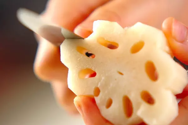 ・レンコンは皮をむいて花形にし、さらに薄切りにして分量外の酢水につける。熱湯でサッとゆで、分量外の作り置き甘酢大さじ1をかける。