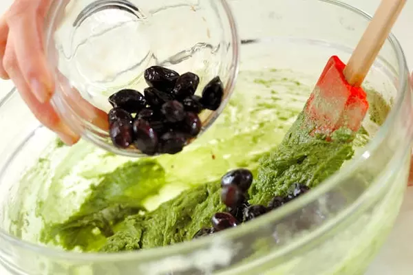 2、1に振るった粉類を加え、泡立て器からゴムベラに変えてサックリと混ぜ合わせ、さらに煮黒豆を加えて混ぜ合わせる。