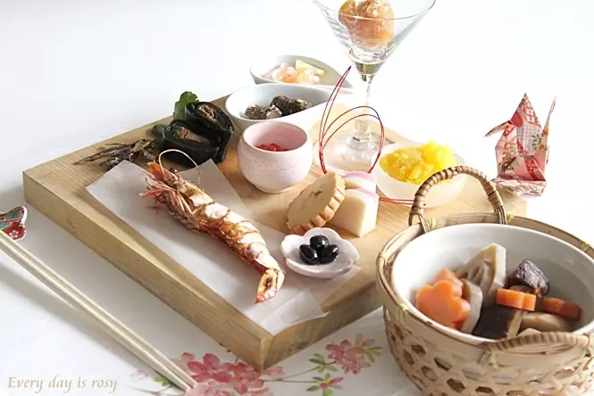 シンプルなお皿も素敵ですが、ちょっと雰囲気を変えて木製のプレートに品よく飾られたワンプレートおせちをご紹介してくれたのは、ブログ「毎日がバラ色」のhana-2403さん。
