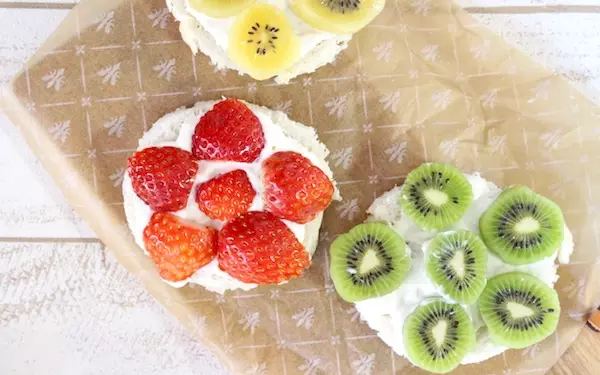 ココアを入れずに、食パンを大きめの丸いセルクル型で抜いてショートケーキ風にアレンジ。食パンと水切りヨーグルトの間にキウイとイチゴをサンドして、上にもトッピングしてみました。