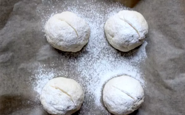 4、薄力粉を茶こしに入れて少々ふる。焼いている途中でパンが割れないようにクープ(切り込み)を入れる。