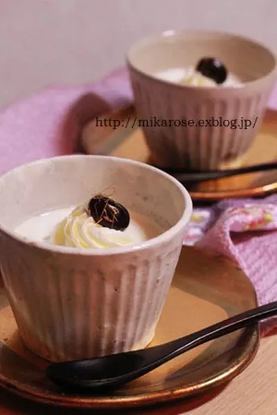 「下層は、煮汁にブランデーを少し入れたもの。上には黒豆寒天をのせて、お好みで生クリームと黒豆をトッピングしてみました」というmikaroseさん。寒天と黒豆がキラキラして、まるで高級和菓子店や甘味処の和スイーツのようです。