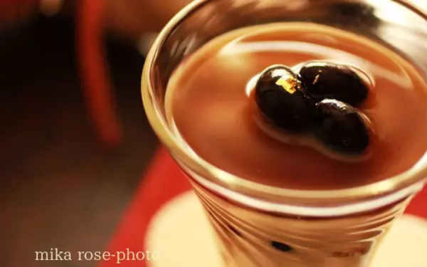 黒豆の上に金粉を飾っているうえ、グラスに入れた見た目もおしゃれな雰囲気なので、おもてなしにも喜ばれそうですね。