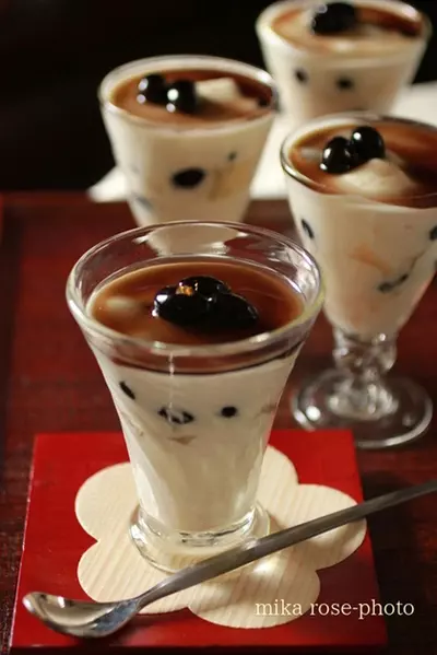「黒豆の残りものに半分使いかけのクリームチーズと生クリーム、牛乳、粉ゼラチンを足してグラスチーズケーキを作りました。お子さんもおいしくいただけますよ」というmikaroseさん。そのレシピも教えてくれました。