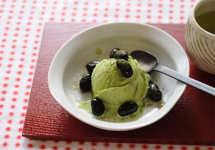 ときには、こんなふうに抹茶アイスに黒豆を添えていただくだけでもおいしそうです。抹茶アイスと黒豆もよく合う味ですね。