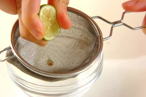 1、網を通しながらスダチを搾り、しょうゆと合わせる。器に大根を盛り、<ドレッシング>をかける。