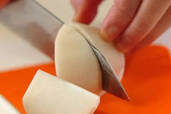 1、カブは葉を切り落として皮をむき、8等分のくし切りにする。ニンジンは皮をむいてひとくち大の乱切りに、白菜は3cm角のザグ切りにする。