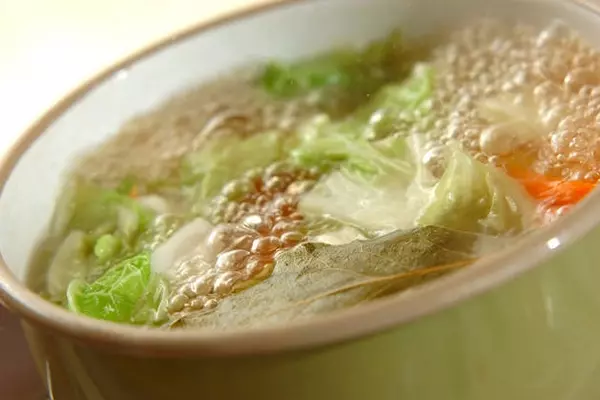2、鍋にソーセージ、(1)、水、顆粒スープの素、ローリエを加えて中火で10分煮る。