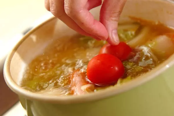 3、ローリエを取り出し、ヘタを取ったプチトマトを加えて塩コショウで味を調える。器に盛り、粒マスタードを添える。