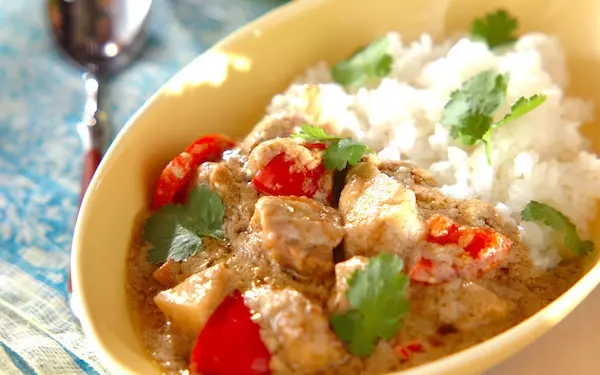 作り方は、フライパンにサラダ油を熱し、鶏もも肉を両面こんがり焼き、塩コショウを振ります。ニンニクと赤唐辛子も加えて1~2分炒め、ココナッツミルク、水煮タケノコ、赤パプリカを加え煮たったら、中火で3~4分煮ます。そして、カレールウ、ナンプラーを加え、さらに5~6分煮ましょう。器にご飯をよそって出来上がったカレーをかけ、香菜を散らせば完成! 辛さ控えめなので、お子様でも食べられそう。