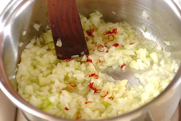 1、<スープ>を作る。鍋にオリーブ油、ニンニクを入れて中火にかけ、ニンニクの香りが立ってきたら玉ネギ、セロリ、刻み赤唐辛子を炒め合わせ、他の<スープ>の材料を加える。煮立ってきたら<野菜スープ>を加える。
