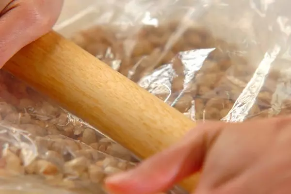 ・大豆をビニール袋に入れ、麺棒を転がして粗くつぶす。クッキングシートの上に広げておく。