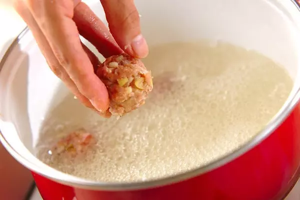 2、<スープ>の材料を鍋に合わせて強火で煮立て、<肉団子>を4~6つに丸めて落とし入れる。