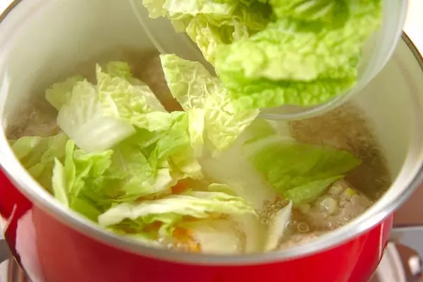 3、アクを取って肉団子が浮いてきたら、白菜の軸を加える。再び煮立ってきたら、ニンジン、白菜の葉、春雨を加え、5~6分煮て塩コショウで味を調える。器に注ぎ分け、お好みで分量外の粗びきコショウを振る。