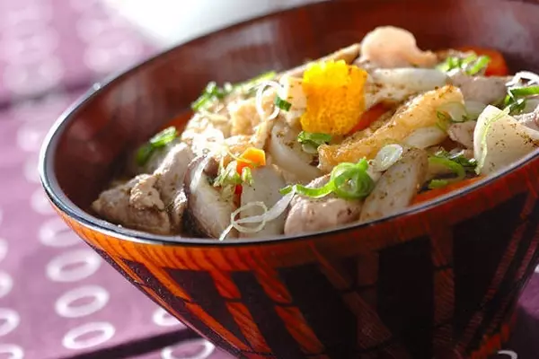 1、鍋にゴマ油を強火で熱し、豚薄切り肉が白っぽくなるまで炒める。大根、ニンジン、ゴボウを炒め合わせ、生シイタケを加えてさらに炒め合わせる。