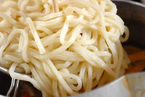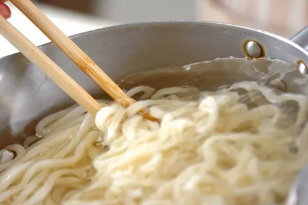3、油揚げを加えてみそを溶き入れ、再び煮立ったらうどんとしょうゆを加えて火を止める。
