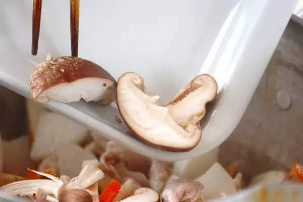 ・生シイタケは汚れを拭き取り、石づきを切り落として軸と笠に分け、軸は縦に裂き、笠は4等分に切る。