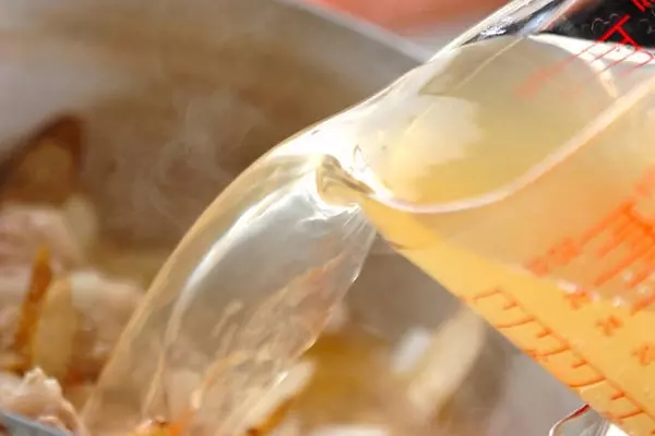 2、全体に炒められたらだし汁を加え、煮立ったらアクを取り、具が柔らかくなるまで12〜15分煮る。