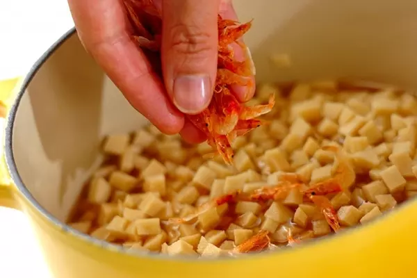 <作り方>1、小鍋にお米と<調味料>と分量の水を入れる。高野豆腐と干し桜エビを均等に散らし、干しシイタケをのせる。かつお節を上から全体にかける。