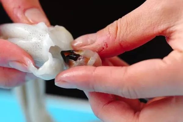 ・イカは胴と足がくっついている所を指で引っ張ってはがし、足を持って胴から引き抜く。胴は水洗いして軟骨を抜き取り、幅1cmの輪切りにする。