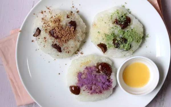 「モチモチ!あまぐりおこわ」を丸めてつぶし、フライパンで焼くだけで幸せおやつができあがります。お好みで甘みを添えて召し上がれ!今回は、ココア、抹茶、紫芋パウダーでおめかししてみました。