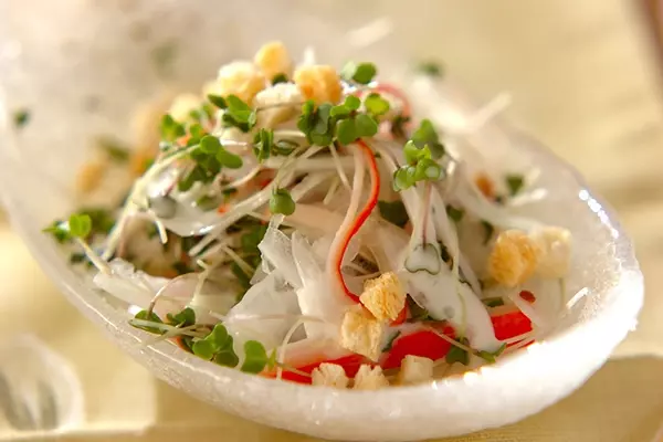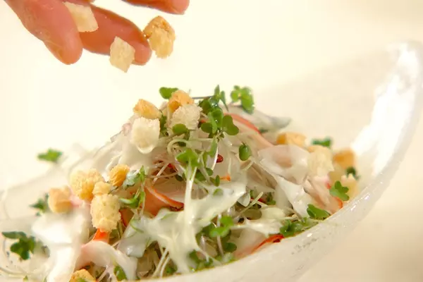 1、新玉ネギ、スプラウト、カニ風味カマボコを混ぜ合わせ、器に盛る。フレンチドレッシングをかけ、クルトンを散らす。