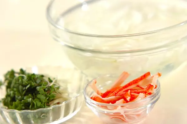 新玉ネギにスプラウトとカニカマを加えて、彩りも美しく、見た目にも楽しい一皿。新玉ネギの優しい甘みとフレンチドレッシングの風味が相性抜群で、とってもおいしいですよ。