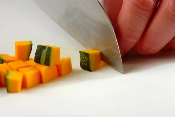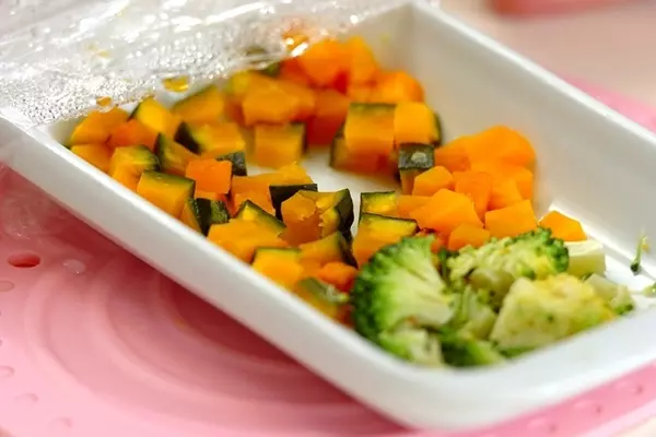 ・カボチャは種とワタを取り除き、食べやすい大きさに切って1cm角に切る。ブロッコリーは小房に分けてひとくち大に切り、共に耐熱容器に入れる。