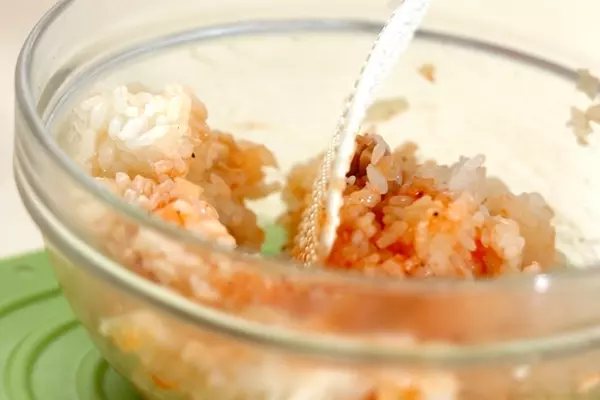 2、ラップを外し、<チキンライスの調味料>の材料、ご飯を加えて、さっくりと混ぜ合わせる。