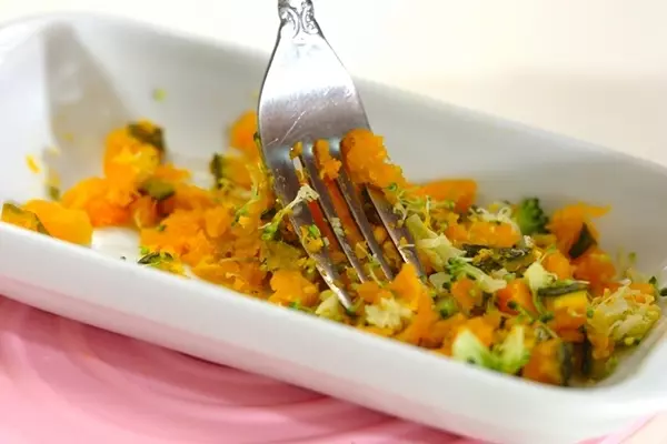 3、<カボチャとブロッコリーのサラダ>を作る。材料の入った耐熱容器を電子レンジで1分30秒~2分加熱する。
