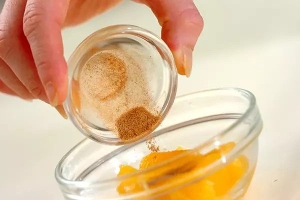 6、<シナモンオレンジ>を作る。オレンジは皮をむき、ひとくち大に切り、シナモンシュガーを振る。