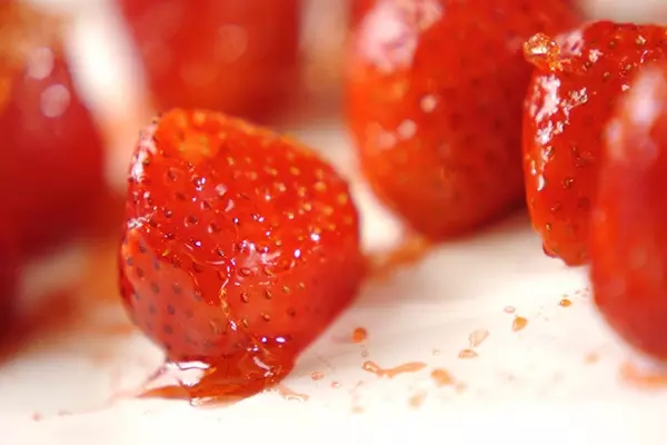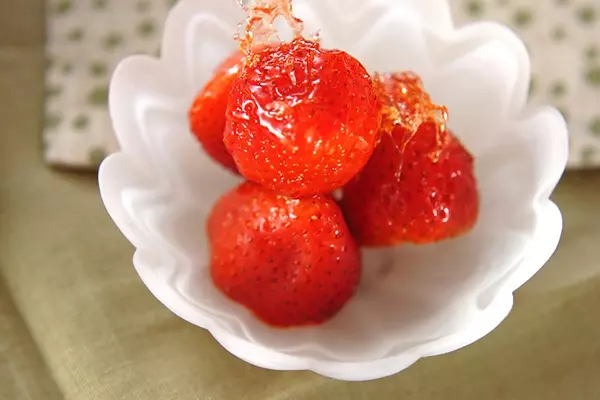 イチゴを熱した砂糖水にからめて冷やせば、かわいい飴の完成! キャンディーではなく「あめ」という呼び名がぴったりのスイーツです。