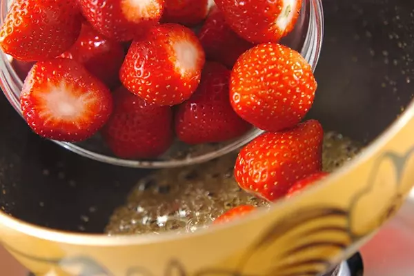 1、フライパンに砂糖と水を入れて火にかけて溶かす。完全に溶けて細かな気泡でいっぱいになり、薄いキツネ色になったら、イチゴを加える。